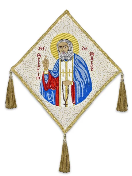 Broderia este realizată cu fire de înaltă calitate, redând cu acuratețe expresia chipului, contururile veșmintelor și detaliile fine. Fundalul crem brodat conferă piesei eleganță, iar pasmanteria aurie și ciucurii decorativi completează designul într-o manieră solemnă, potrivită pentru orice perioadă liturgică.