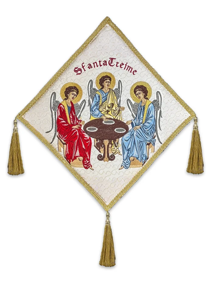 Bederniță brodată cu Sfânta Treime, pe fundal alb-ivoriu, realizată cu broderie detaliată în nuanțe sacre și elemente aurii. O piesă solemnă, simbol al unității și al harului dumnezeiesc.