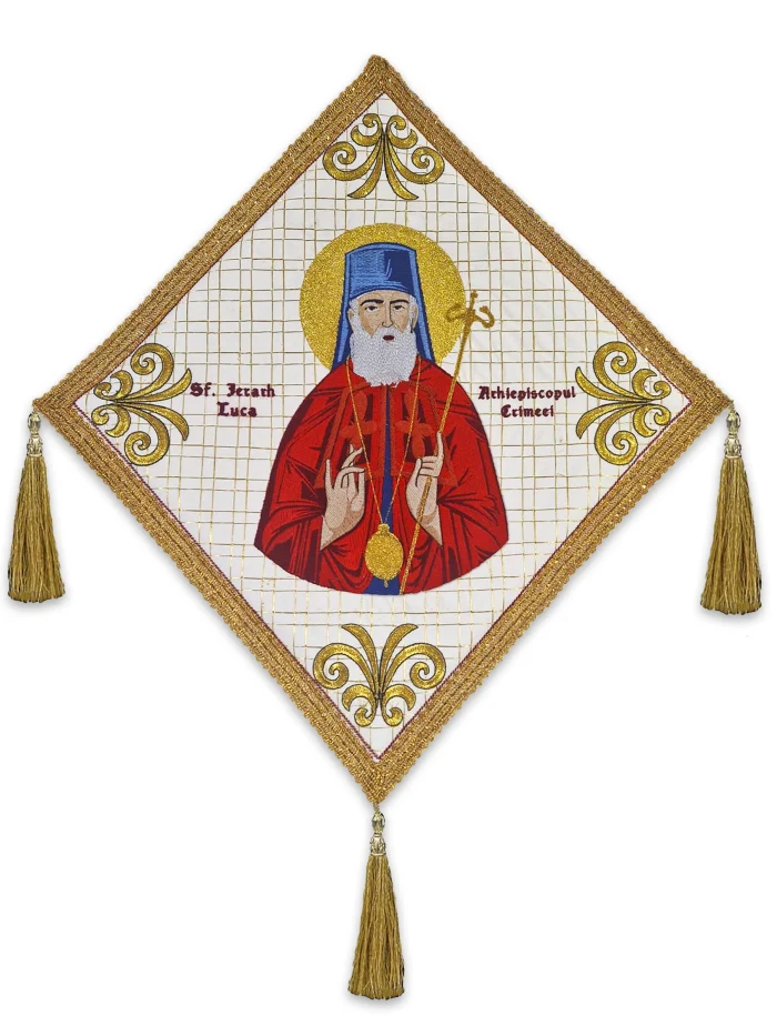 Sfântul Luca este ilustrat purtând veșmânt arhieresc în roșu intens – culoarea mărturisirii și a suferinței –, iar omoforul alb cu cruci negre subliniază demnitatea și curajul cu care a apărat credința în vremuri de grea prigoană. Chipul său, brodat cu atenție în nuanțe line, transmite blândețe și hotărâre, iar bastonul arhieresc și engolpionul auriu amintesc de autoritatea și sfințenia slujirii sale.