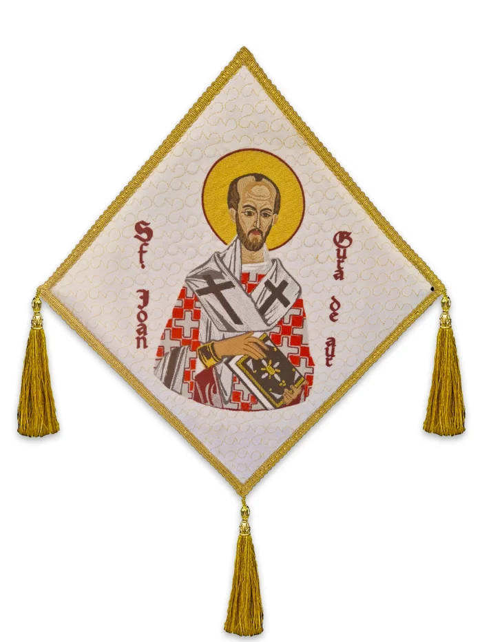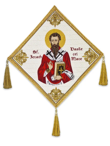În mâini poartă Sfânta Evanghelie, izvorul predicii sale neobosite, iar inscripțiile „Sf. Ioan” și „Gură de Aur” încununează compoziția într-o armonie autentic bizantină. Pasmanteria aurie și ciucurii eleganți conturează piesa într-o notă nobilă, potrivită unui veșmânt liturgic de mare cinste.