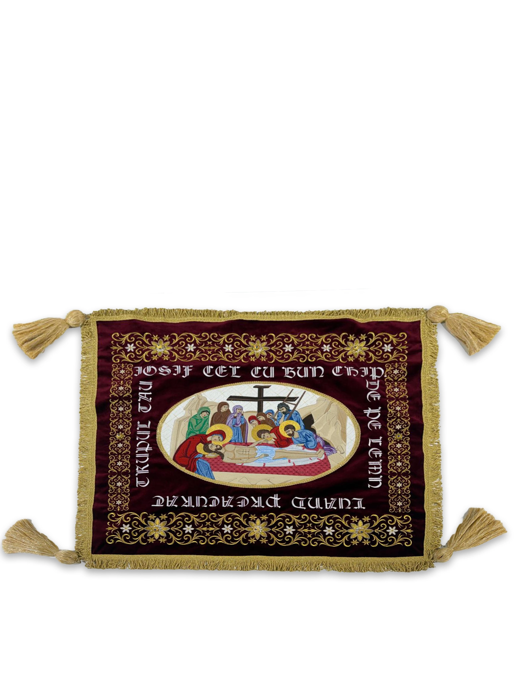 Epitaf liturgic realizat pe catifea grena, având în centru icoana „Punerea în Mormânt a Domnului”, încadrat de broderii ornamentale aurii și franjuri decorative.