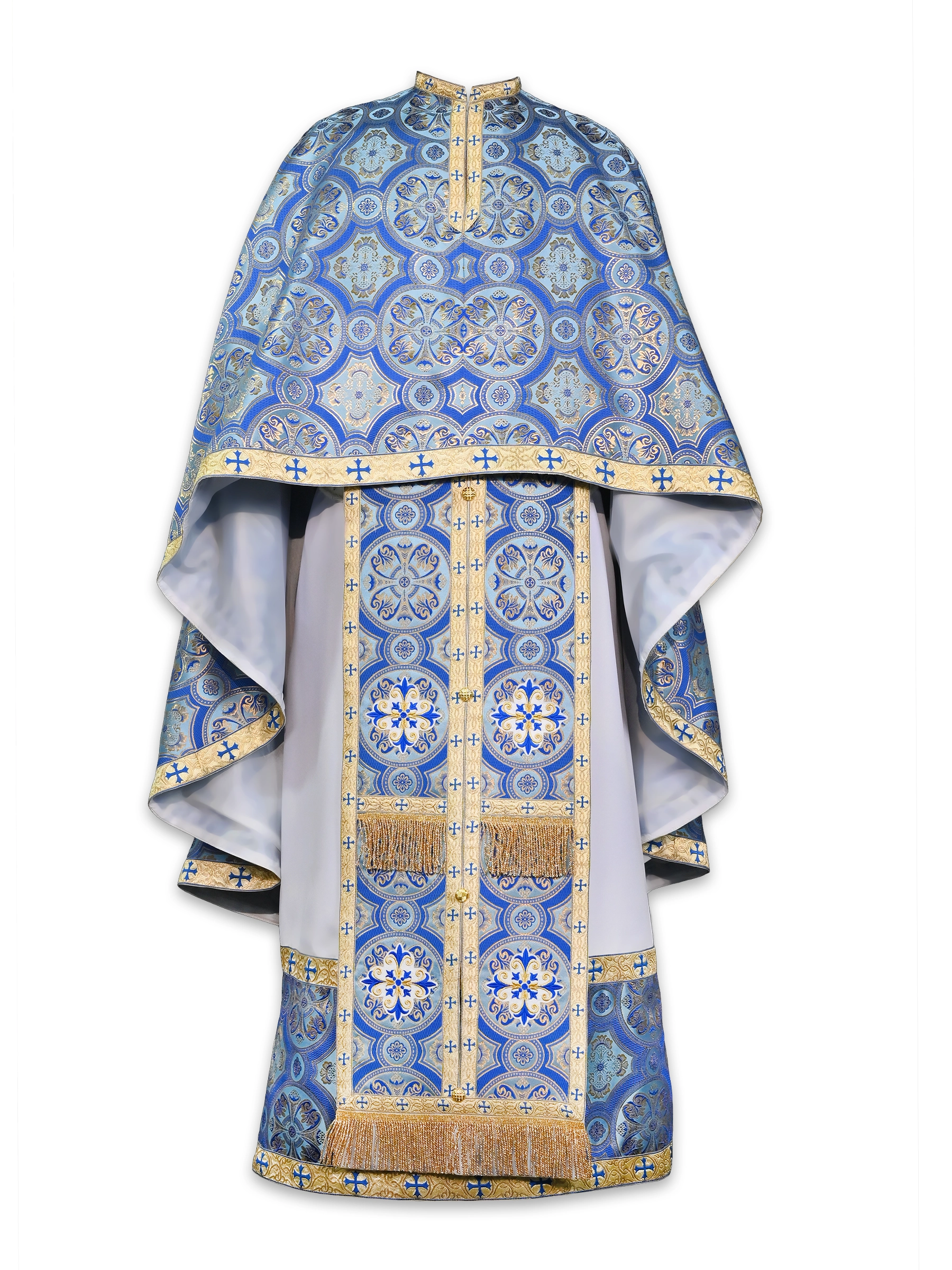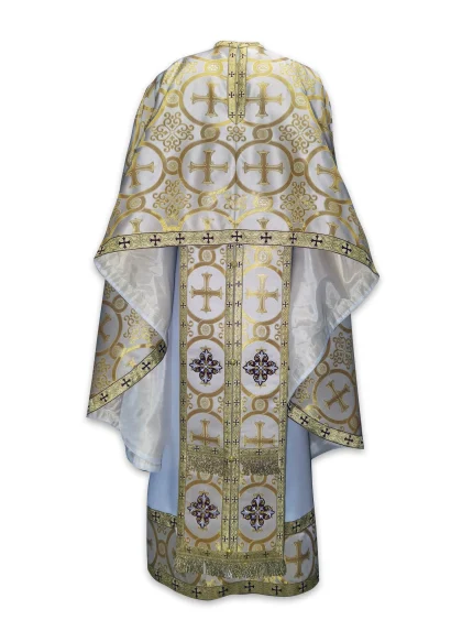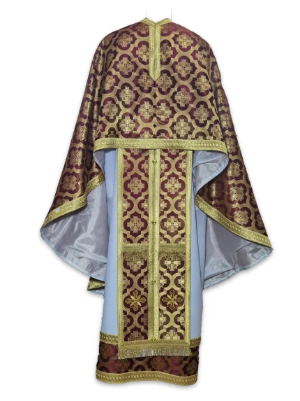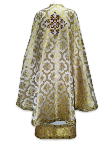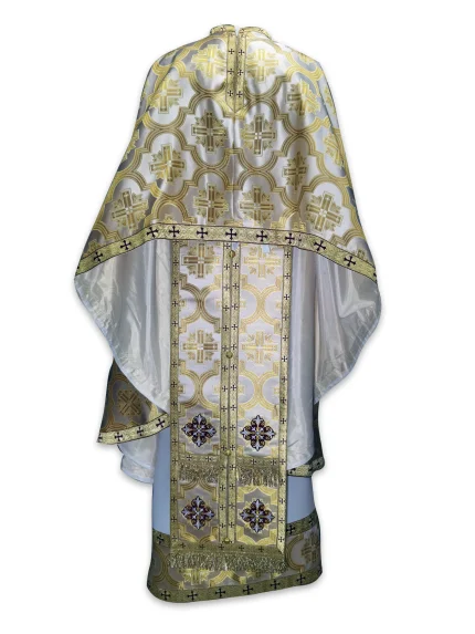 Acest vesmânt preoțesc țesut este realizat din brocard liturgic de înaltă calitate, cu motive ornamentale tradiționale dispuse armonios pe întreaga suprafață a materialului. Țesătura bogată oferă profunzime vizuală și rezistență în timp, fiind potrivită pentru slujbe importante și sărbători deosebite din cursul anului bisericesc.