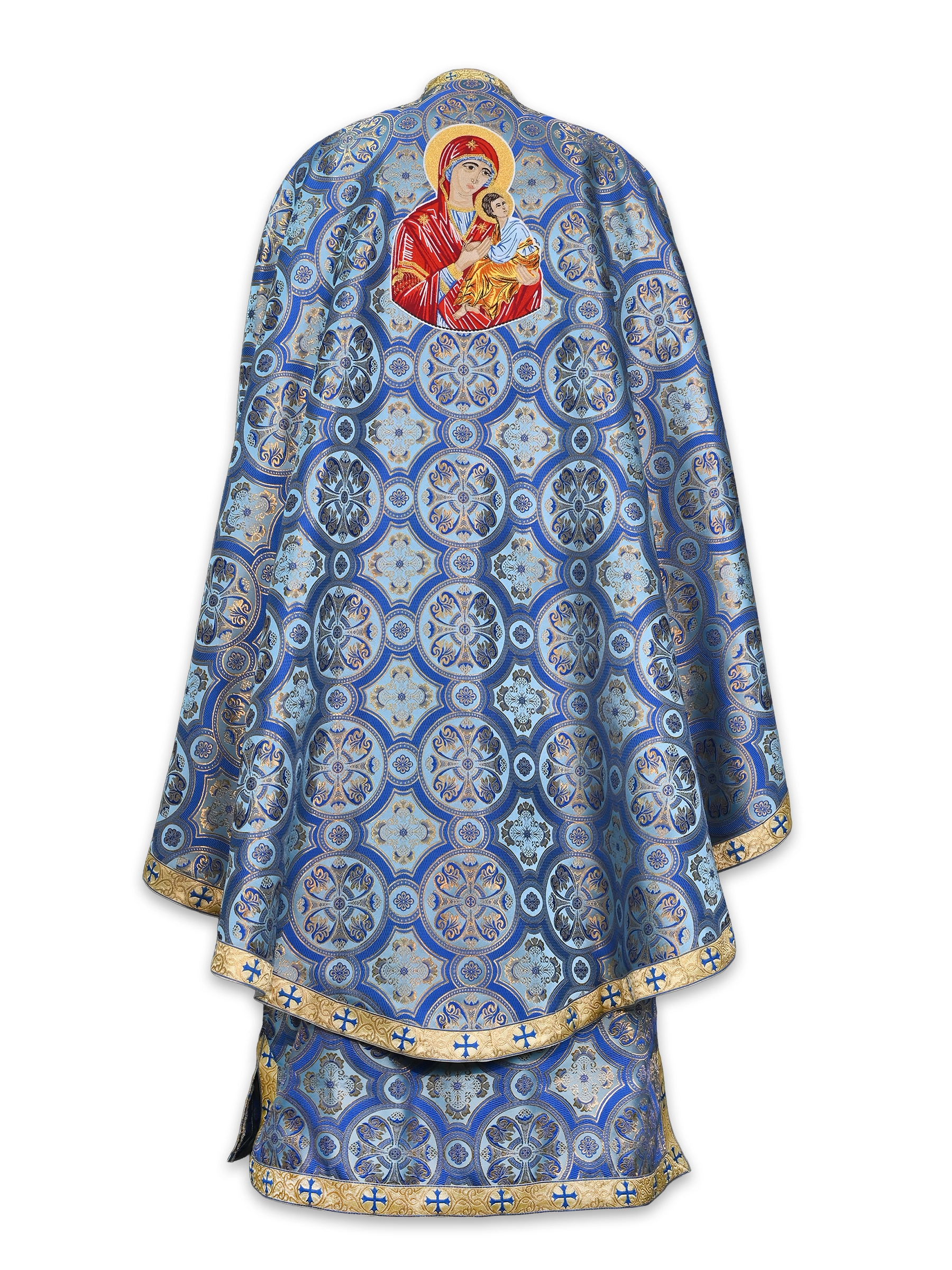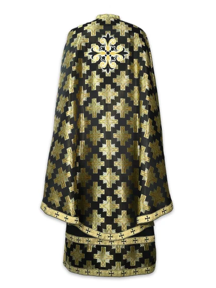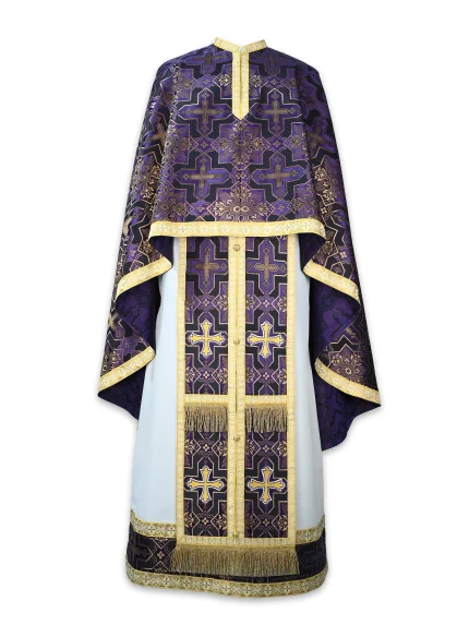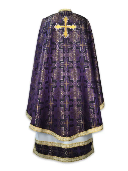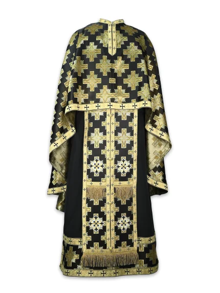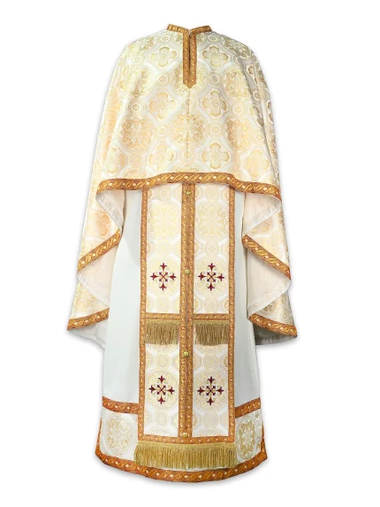 Modelul este completat de icoană brodată pe spate, executată cu atenție la detalii, care adaugă valoare simbolică și solemnitate veșmântului. Finisajele sunt realizate cu galoane liturgice de calitate, iar croiala asigură o cădere elegantă și confort în timpul slujirii.