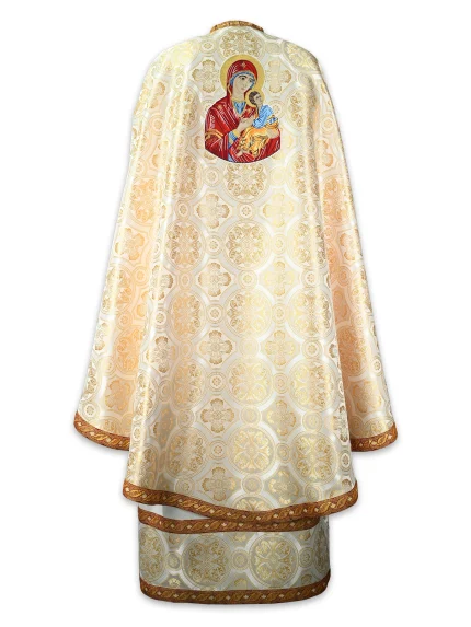 Vesmânt preoțesc țesut din brocard liturgic, cu motive tradiționale și icoană brodată pe spate, realizat pentru slujbe solemne și sărbători împărătești.