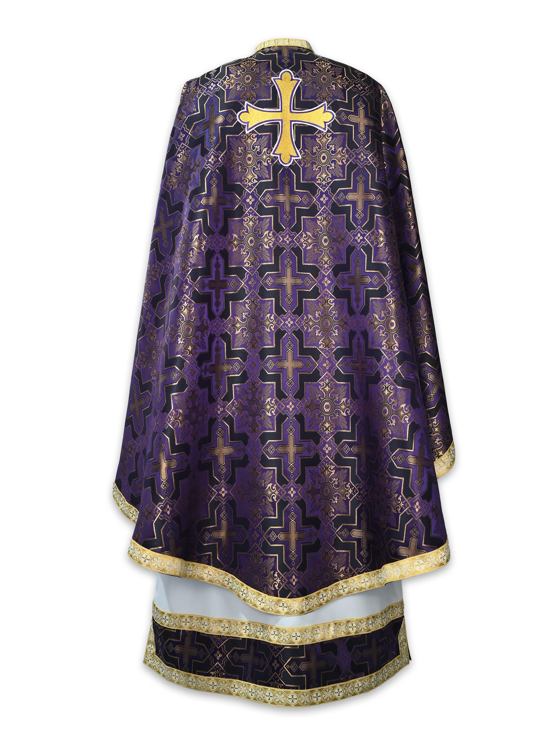 Veșmânt preoțesc țesut T8, realizat din material brocart mov cu motive cruciforme aurii, decorat cu galoane aurii și epitrahil asortat. Potrivit pentru slujbele din perioada Postului Mare și alte momente de solemnitate liturgică.