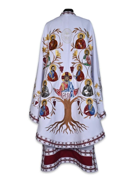 Veșmânt liturgic realizat pe fond negru, decorat cu broderii aurii și argintii în motive ornamentale clasice, completat de epitrahil bogat brodat și cruce bizantină pe spate.