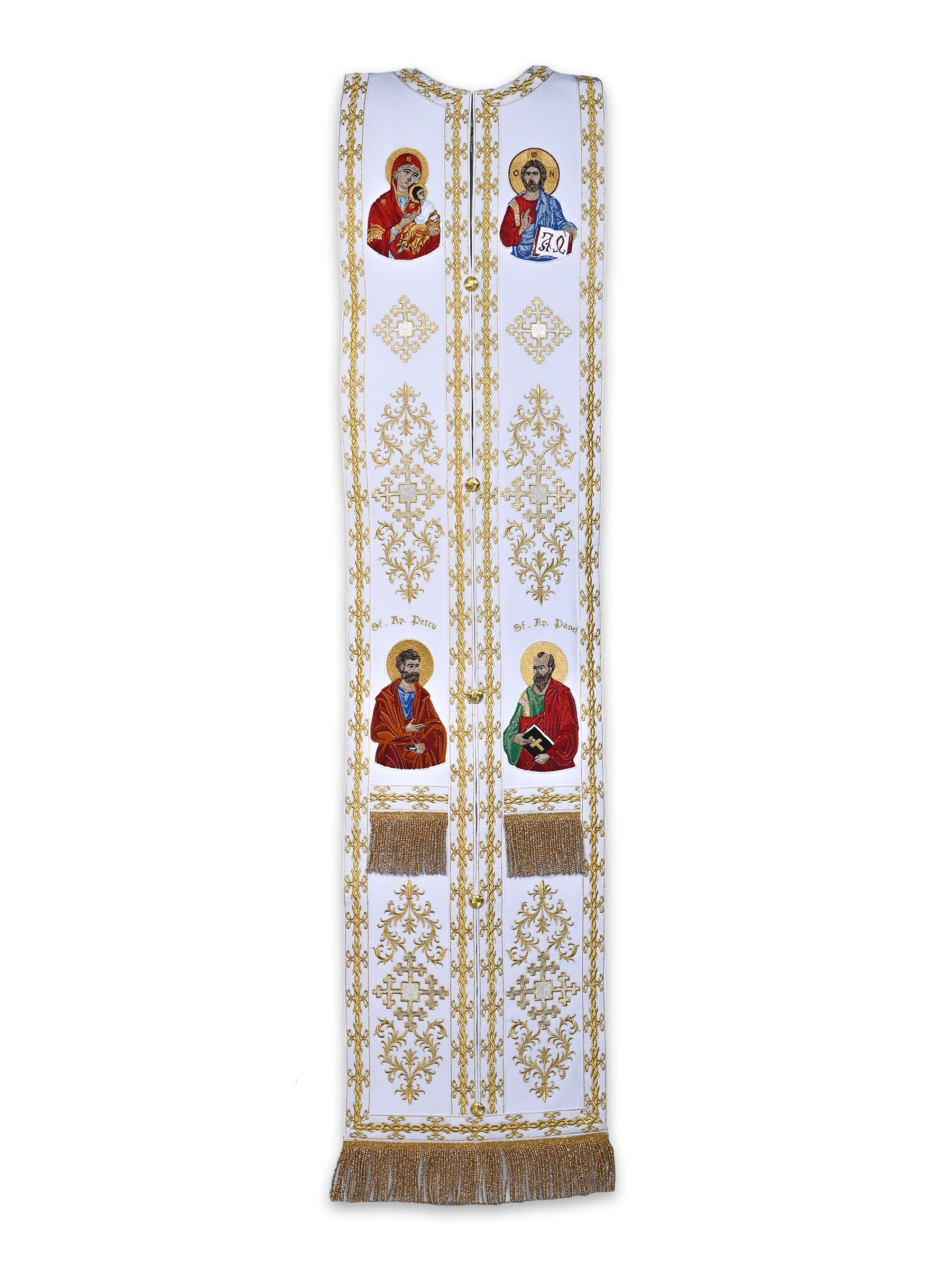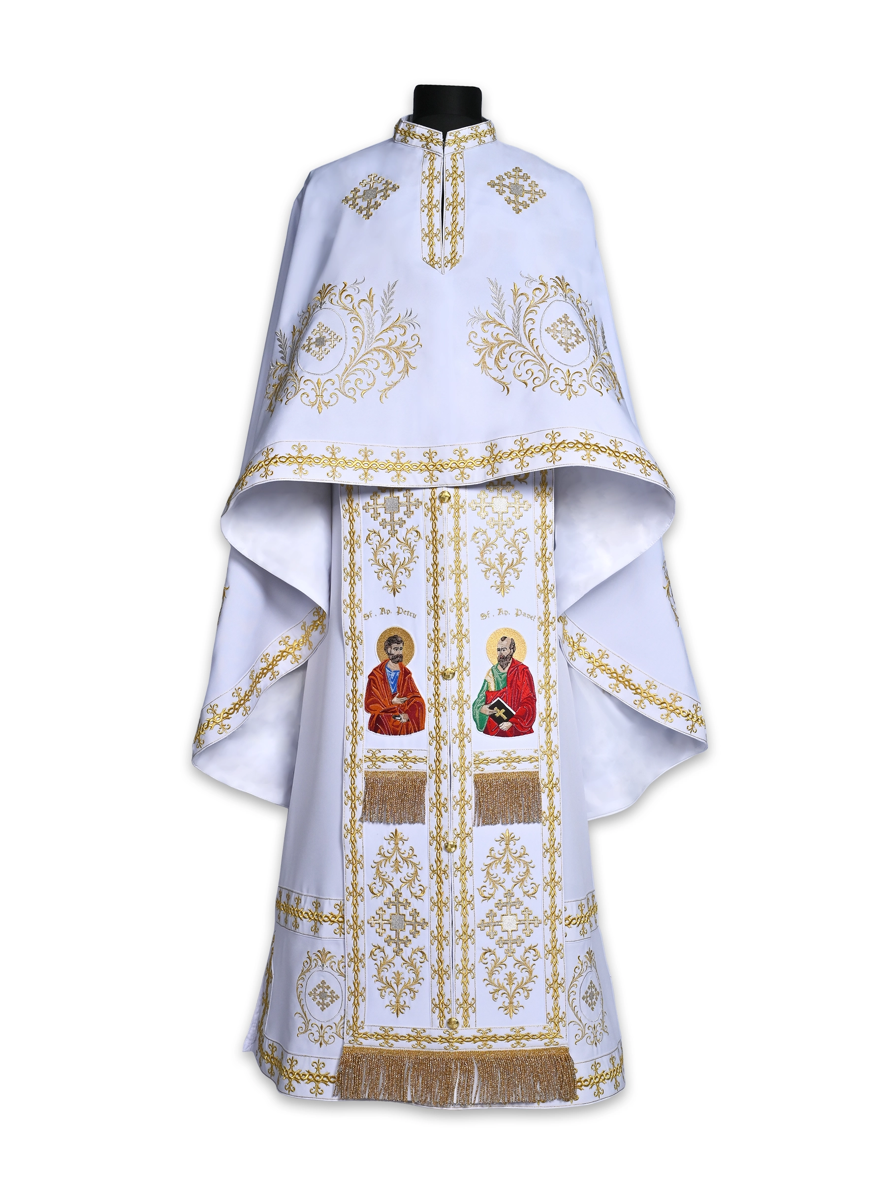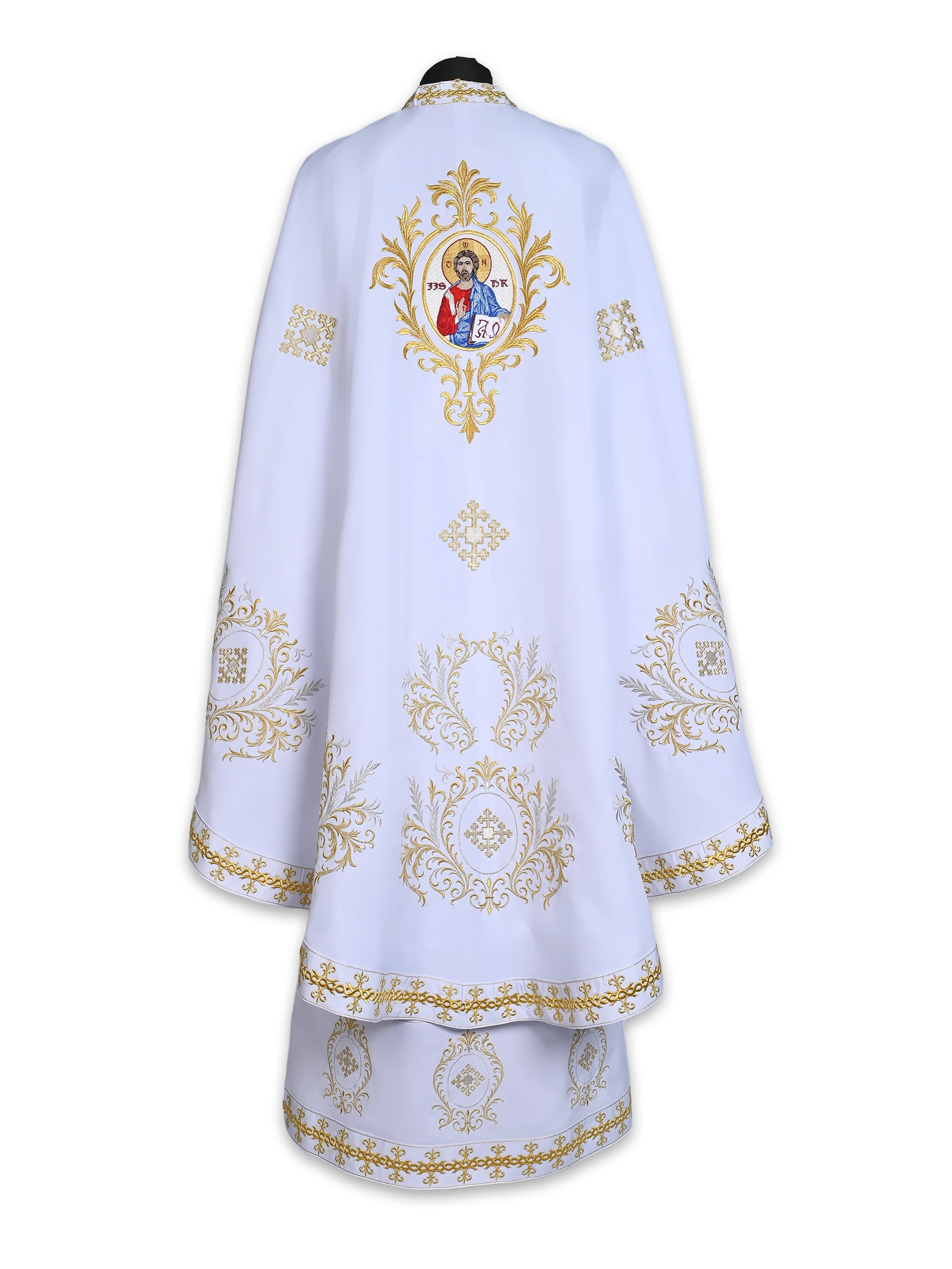 Veșmânt preoțesc alb, cu motive ornamentale aurii și icoană brodată a Mântuitorului pe spate, ideal pentru marile sărbători. Personalizabil la cerere, cu preț variabil în funcție de dimensiuni și broderie.