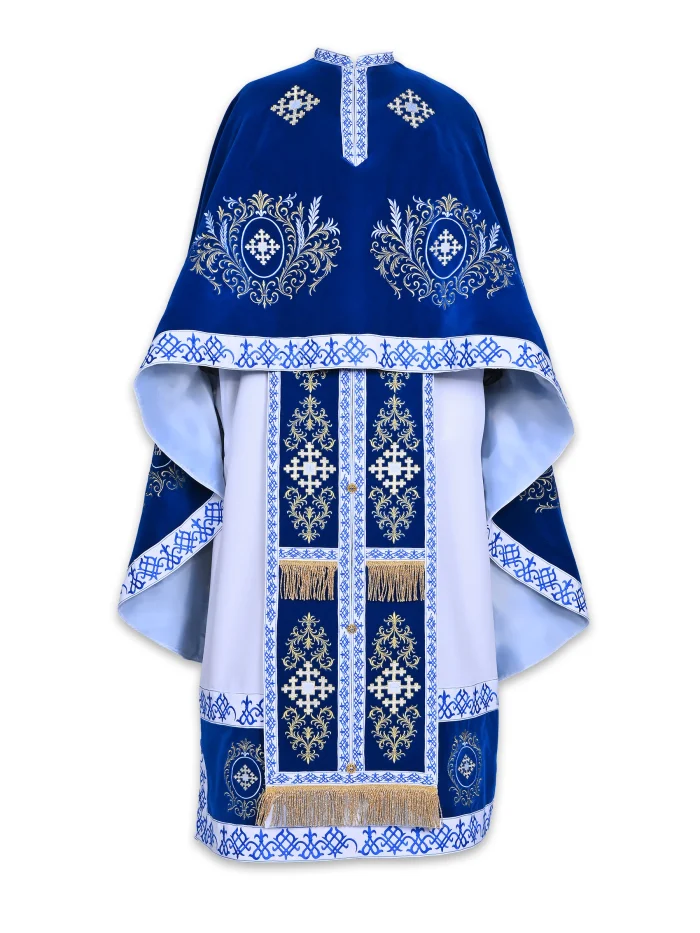 Pe spate este prezentă icoana brodată a Mântuitorului Iisus Hristos, încadrată de elemente decorative aurii, conferind veșmântului un caracter profund liturgic și simbolic. Culoarea albă îl face potrivit pentru sărbători împărătești, Învierea Domnului, Nașterea Domnului, Bobotează, cununii și alte slujbe de bucurie.